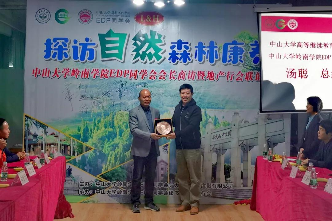 会议渐渐到了尾声,中山大学岭南大学EDP同学会荣誉会长吴海能、汤聪两位分别对本次活动进行了总结发言,并由汤聪荣誉会长代表EDP同学会送出中大纪念品,感谢魏峨会长的热情招待。