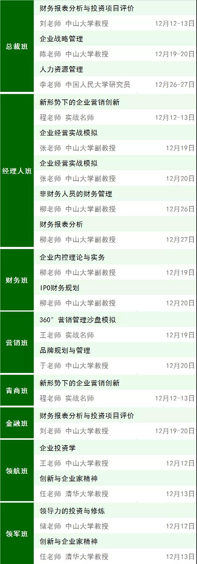 进学致和,行方思远。以下是中山大学高层管理培训课程表,各班级10月24-25日开课,欢迎加入新班。
