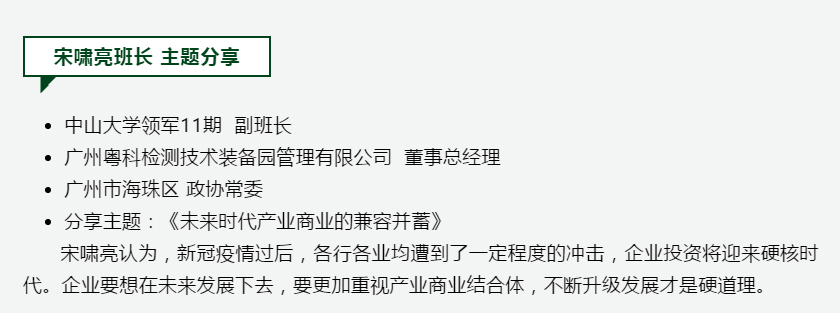 4月27日,中山大学岭南学院EDP同学会班长联合会第二期“班长有曰”主题沙龙聚焦2021疫情过后企业投资新方向。在中山大学岭南学院王燕鸣教授和中山大学高等继续教育中心陈月卉老师的带领下,走进领军3班徐志文班长的企业——粤科海纳检测技术装备园,共同探讨《疫情后的投资新方向》。