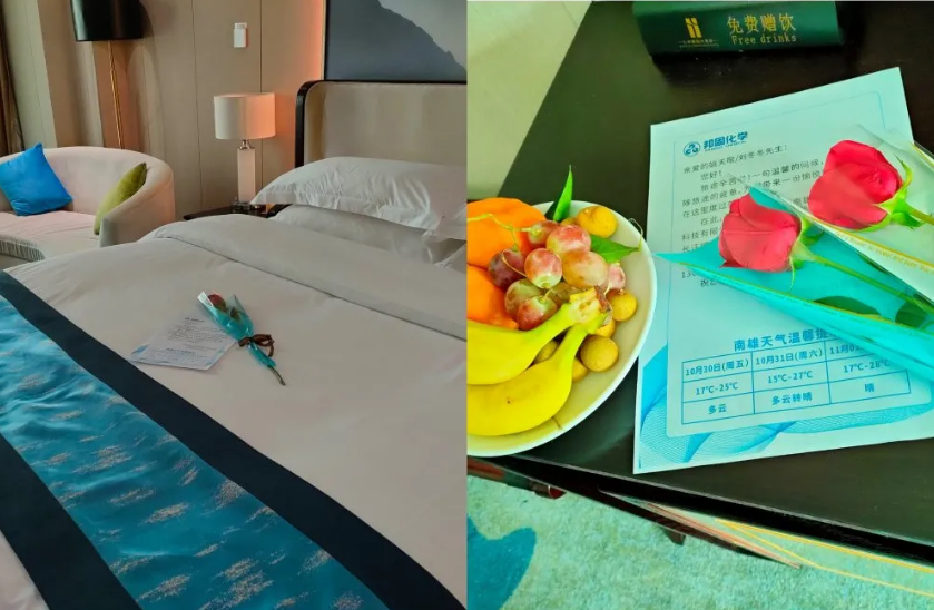 分享学习交流结束后,我们去入住酒店,邦固行政人事早已安排好的酒店及晚宴,小小细节就可以暧动人心,酒店每间房内有准备鲜花、水果,一封温暖信,无微不至的关心简直让同学们温暖如家的感觉,很感动。
