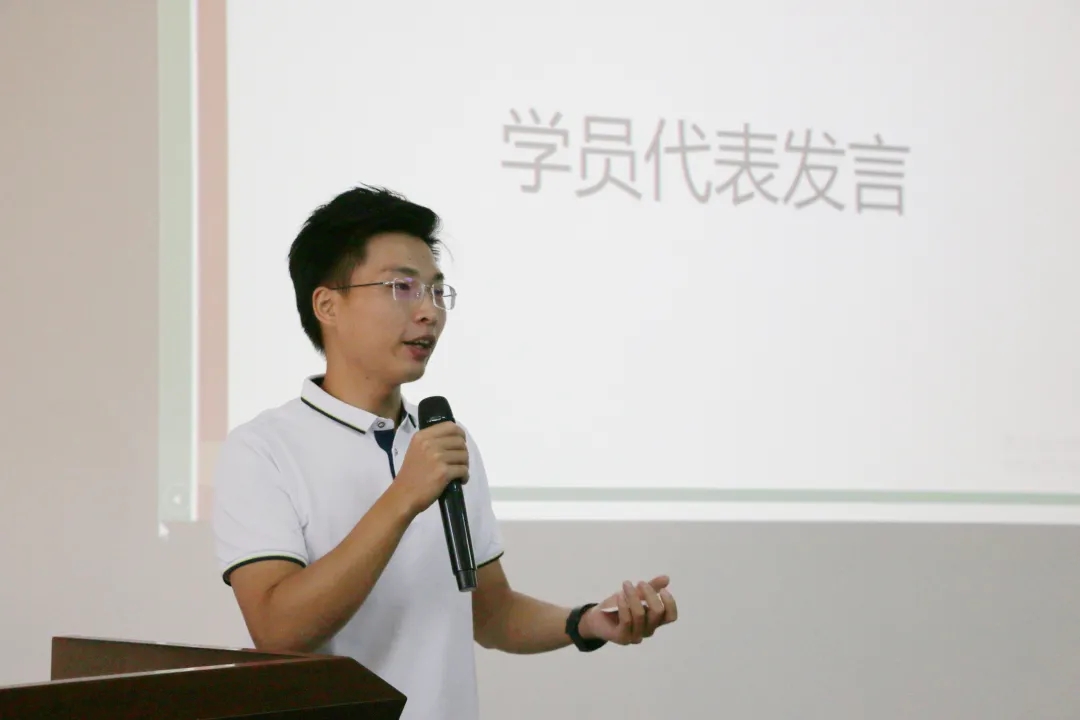 95后创业者、东莞火萤科技有限公司CEO、广东“众创杯”创业创新大赛大学生启航赛团队组银奖得主周良玉作为学员代表发言。他分享了自己的创业经历、创业心得以及百战归来再读书的期待。他表示,近些年来“双创”政策及配套措施的出台,让创业者感受到了满满的获得感。
