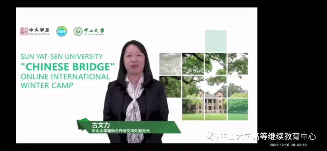 由教育部中外语言交流合作中心主办、中山大学高等继续教育中心承办的中山大学2021年“汉语桥”线上国际冬令营开营典礼于2021年12月6日(星期一)中国北京时间18点30分顺利开营。
