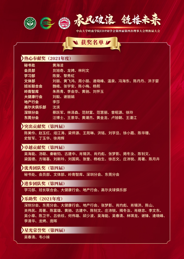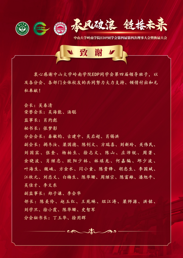 12曰29日下午,“承风破浪,链接未来——中山大学岭南学院EDP同学会第四届第四次理事大会暨换届大会”圆满举办!中山大学领导老师,EDP同学会顾问,会长部长,理事成员,高教中心校友会,岭南学院EMBA、MBA校友会,管理学院EMBA、EDP校友会,北大汇丰、华工和暨大等友校嘉宾等参与本次大会,共同回顾第四届辉煌成绩,共话同学会新发展。