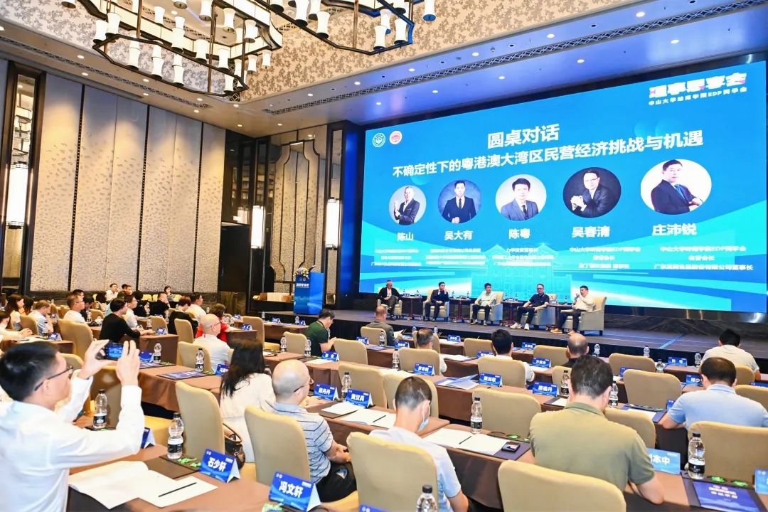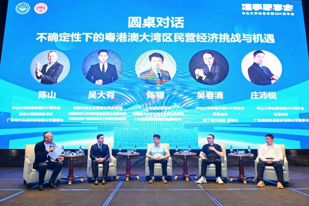 圆桌对话环节,由同学会联席秘书长、创大弘远科技董事长陈山领衔中国数据资产国际标准化工作组专家组成员吴大有、力华投资董事长陈粤、拉丁餐饮集团董事长吴春清荣誉会长、真美食品董事长庄沛锐名誉会长等行业专家及校友企业家为校友们呈上干货满满、精彩纷呈的大咖对话,并以“不确定性下的粤港澳大湾区民营经济挑战与机遇”为主题进行深度探讨。