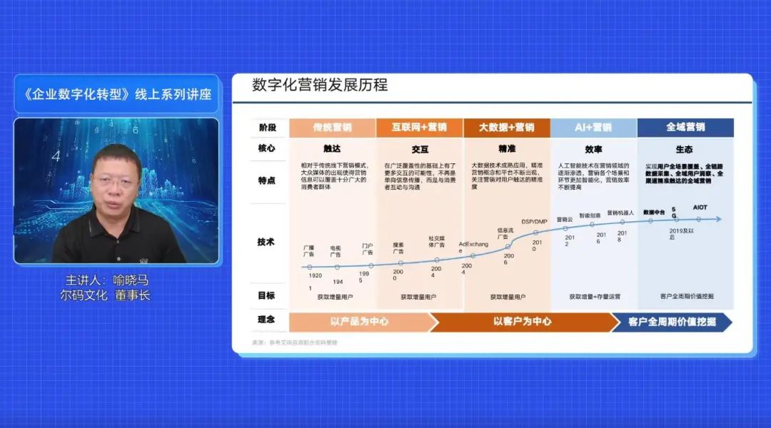 10月13日,中山大学继续教育学院校友会数字化行会(筹)第三期线上讲座在广大校友的支持下圆满结束。此次线上讲座由中大岭院EDP同学会副会长、尔码文化董事长喻晓马校友主讲,围绕《数字化营销的战略设计》为校友们作主题分享。此次讲座吸引近五百人次在线观看交流,并吸引到从事数字化行业的热心校友加入关注,为数字化行会的筹备工作赋能。期待中山大学继续教育学院校友会数字化行会(筹)在师生校友的共同努力下盛大启航,聚力前行!