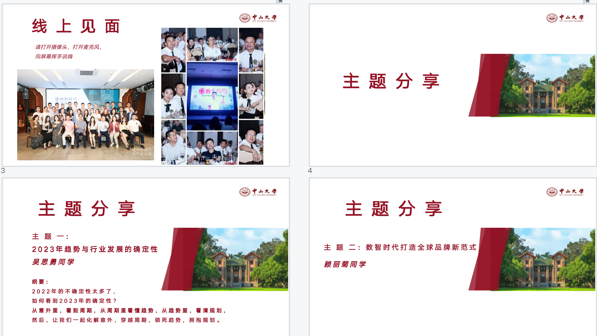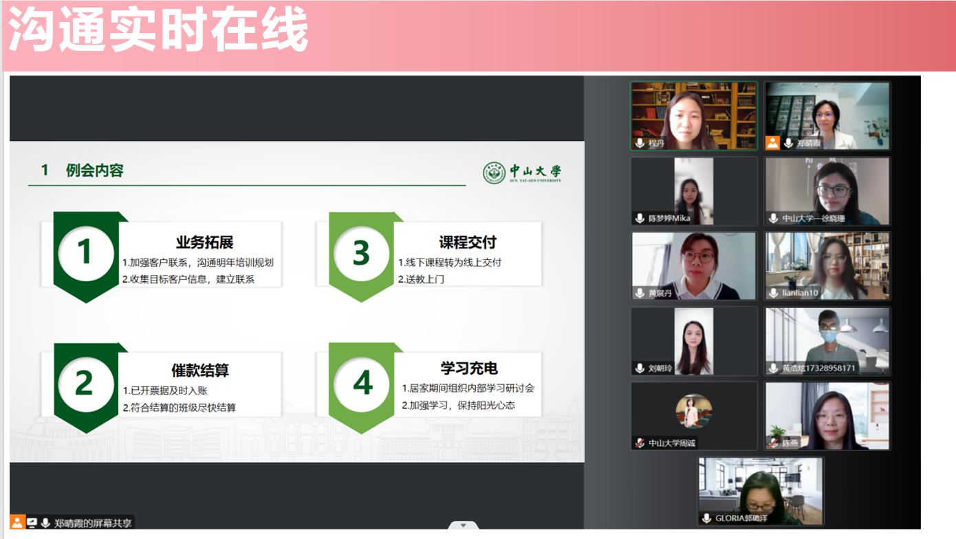 11月23日,中山大学第19-21期营销班联合组织了一场线上见面交流会。在这场"云见面"活动中,同学们除了相互分享日常,传递正能量,还与班导师一同针对《B2B、B2C企业如何进行线上推广》&《探究消费者心理的方法》主题进行了探讨。
