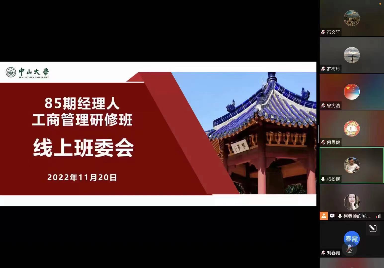 11月20日,中山大学第84期经理人班线上主题分享会圆满举办。同学代表们结合以往课程内容分享了国学智慧和如何跳出思维框架,班导师卓副教授总结后引导大家更进一步思考,同学们纷纷表示云学习也收获多多!