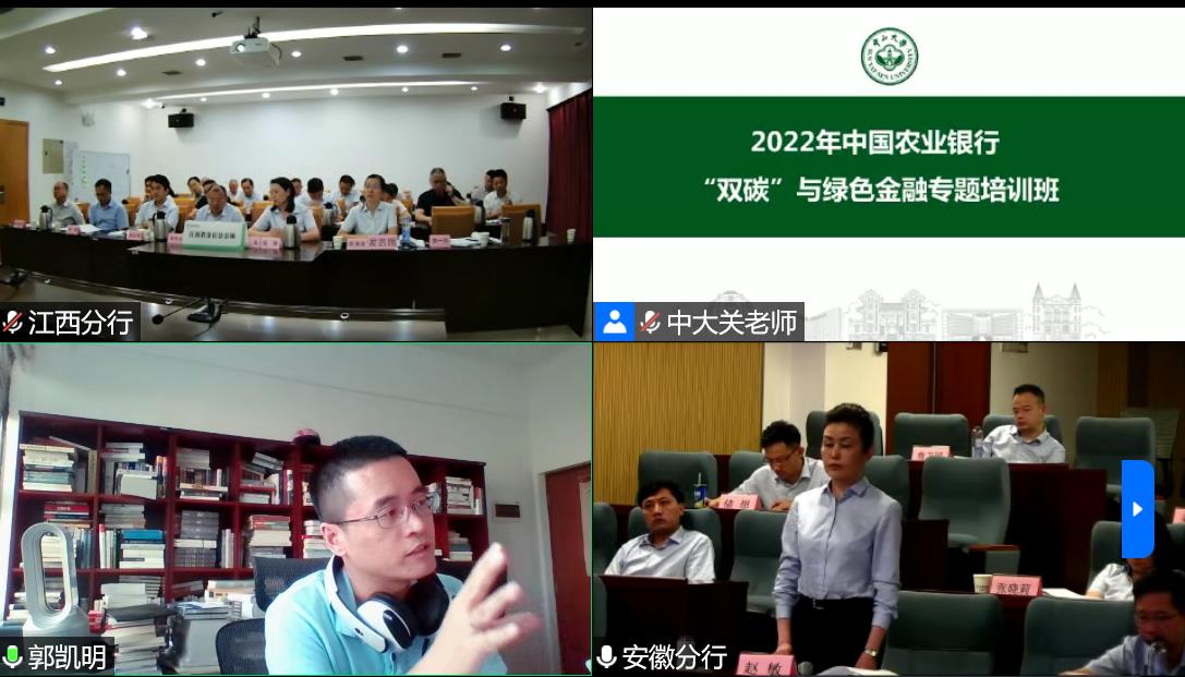 其中,2022年中国农业银行“双碳”与绿色金融专题培训班圆满结束,此次教学成功以线上形式开展。中国农业银行研修中心和中山大学继续教育学院双方领导高度重视,狠抓教学质量、教学服务和课前沟通,并通过课题任务、课前分享、课题发表、课后考试等外力牵引,创新引入了云参访,引导学员认真听讲和积极互动,线上教学有序开展,云端课堂同样精彩。