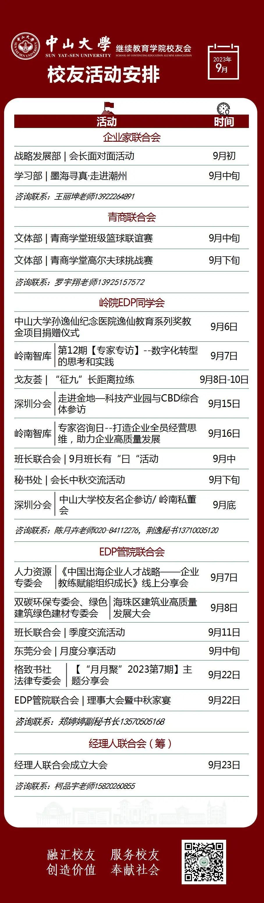 校友活动月报: 传递最新校友活动播报。处暑至,夏未央,2023年8月,校友会各分组织不负时光放异彩,举办了多场精彩纷呈的活动。链接校友,创新价值,打造高质量校友交流平台,欢迎校友们关注支持,一起向未来!