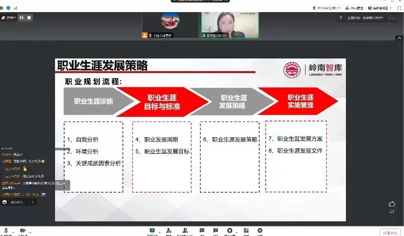8月22日,中山大学岭南学院EDP同学会岭南智库顺利举办【智库专家一席谈】线上沙龙活动。岭南智库人力资源专季会委员脱慧敏,与30多位校友分享了《Z时代职业生涯规划》话题,核心内容如下:一是Z时代的职业特征:目的性、社会性、稳定性、规范性、群体性 ;二是职业规划的两个方面:于个人而言、于企业而言综合两方面来规划职业生涯;三是职业生涯三个阶段:生存期、发展期、自我实现期。活动分享的内容详实,且具实战性,众多校友在直播间及群内踊跃交流。