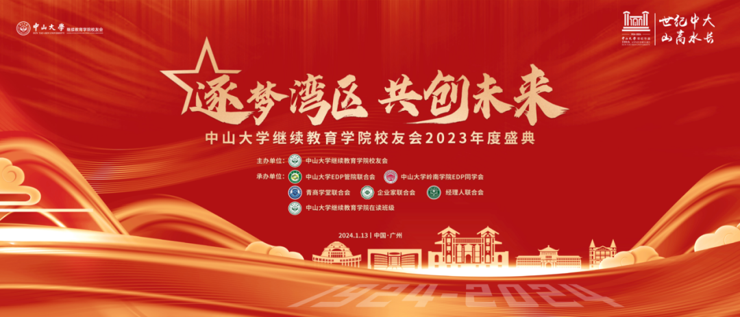 2024年1月13日,“逐梦湾区·共创未来”中山大学继续教育学院校友会 2023年度盛典在广州成功举办。中山大学继续教育学院、产业集团领导和授课老师代表,继续教育学院校友会各校友组织理事会成员、在读班级校友等近千位来宾欢聚一堂,共襄盛举。