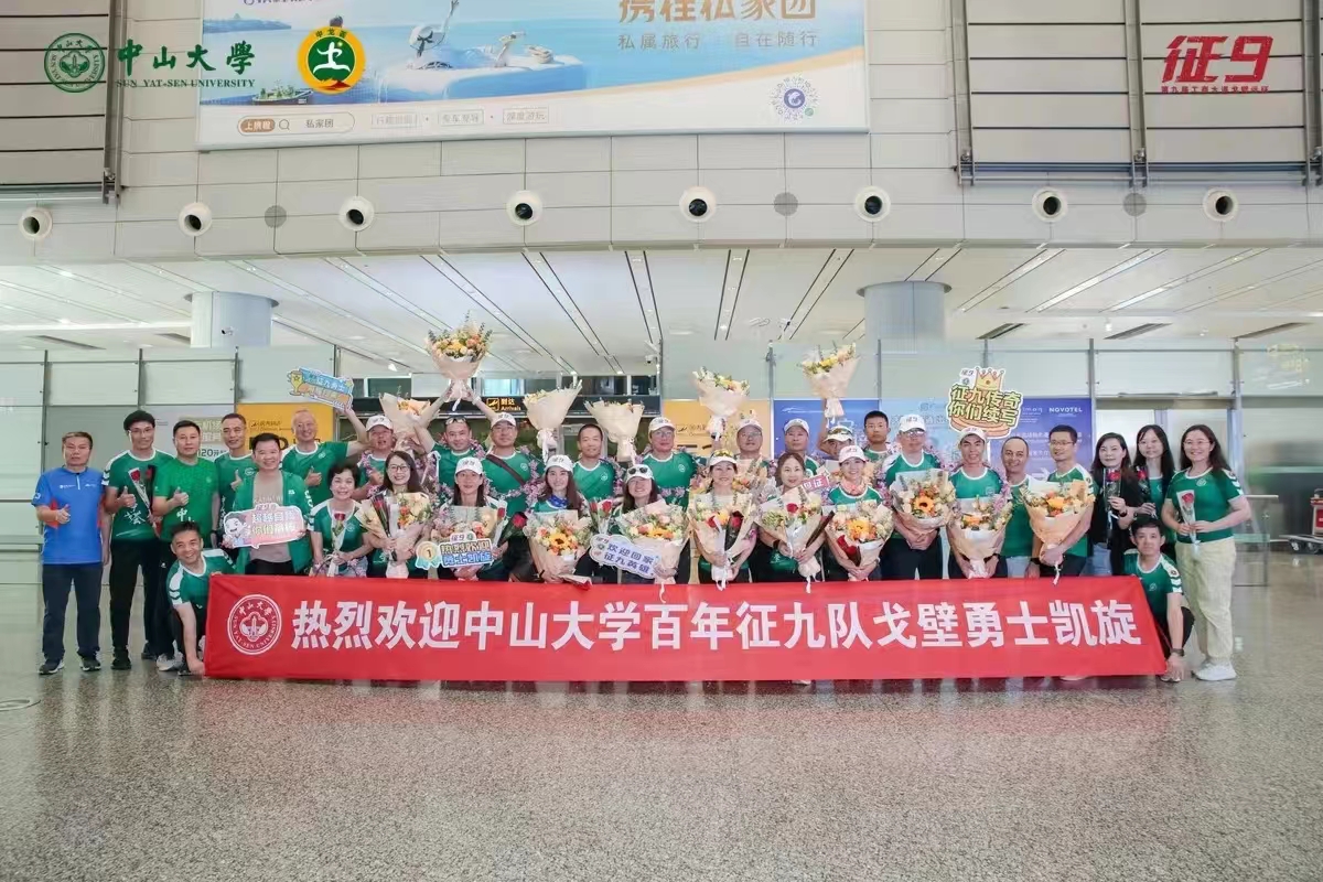 4月30日-5月3日,第九届工商大道中国经营者远征赛成功举办。中大、清华、北大、人大、中欧等诸多所商学院的数百名师生汇聚于大漠戈壁莫贺延碛,完成4天122公里戈壁远征。经过几天的顽强拼搏、团结奋战,中山大学百年征九队荣获团队冠军奖、沙克尔顿奖、敢当无我奖、永不止步奖、追风十强奖、师道践行奖、优秀领队奖、同心远征奖等多项大奖。5月5日,中大征九队的戈壁勇士们携满满荣誉凯旋而归,中山大学继续教育学院韦小妹老师、柯品宇老师及资深戈友携带横幅鲜花前往机场迎接冠军队伍。