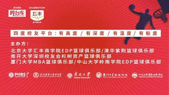 2018中国商学院“秒台车杯”篮球联赛,由中山大学岭南学院EDP篮球俱乐部、北京大学汇丰商学院EDP篮球俱乐部、清华紫荆篮球俱乐部、南开大学深圳校友会杉树资产篮球俱乐部、厦门大学MBA篮球俱乐部五所国内知名商学院联合发起。