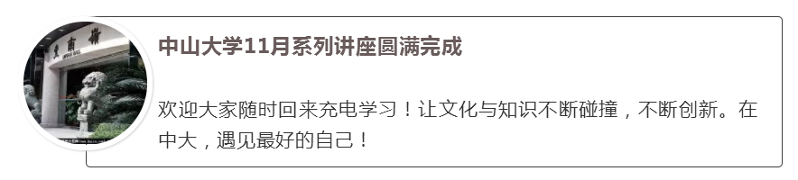 1924年至今,中山大学迎来了94年周年校庆,朗朗读书声中,我们不忘“博学、审问、慎思、明辨、笃行”的中大校训。十一月,系列精彩讲座开设,校友们回到母校,重温学生时光!