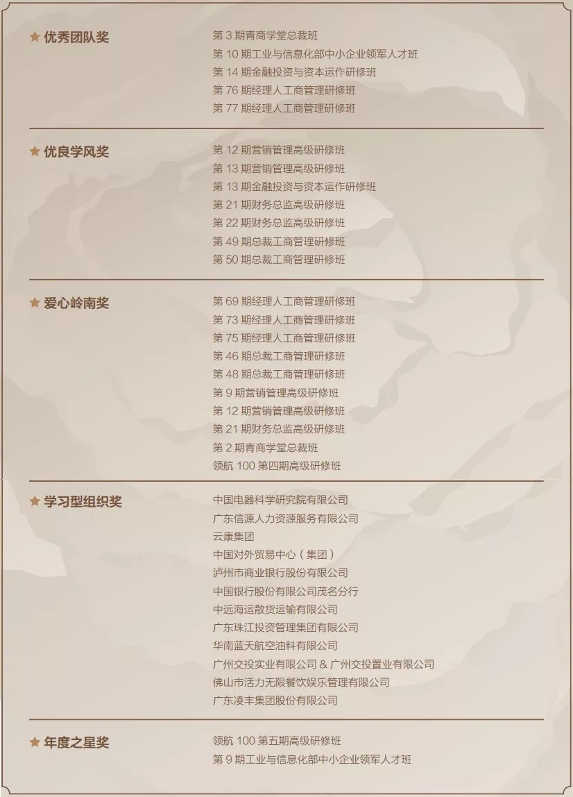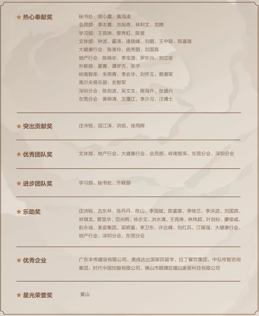 为了表彰在2018年表现出色的团队和个人,本次年会还颁发了热心奉献奖、突出贡献奖、优秀团队奖、进步团队奖、乐助奖、优秀企业奖、优良学风奖、爱心岭南奖、学习型组织奖、年度之星奖、星光荣誉奖。