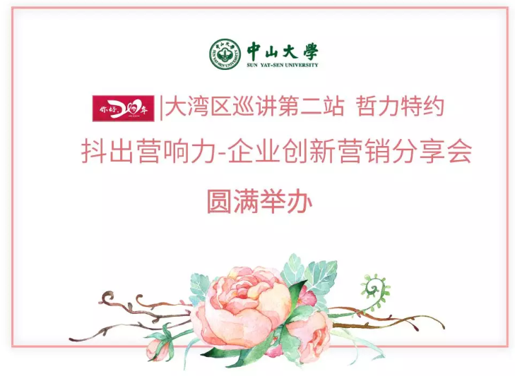 2019年,EDP中心继往开来,传承岭南精神,携手中大紫荆,迈向20年!朗朗读书声中,我们不忘“博学、审问、慎思、明辨、笃行”的中大校训,4月25日“抖出营响力-企业创新营销分享会”圆满举办,中山大学岭南学院教授、博士生导师张斌老师、中山大学高等继续教育中心副主任韦小妹老师、广东哲力知识产权事务有限公司董事长揭冬汝校友、巨量引擎广东分公司总经理徐嘉年先生、运营总监陈景清女士、广州尔玛文化传播有限公司董事长喻晓马校友、阿道夫市场总监伍屯颖女士和300多名校友及企业高管共同出席,本次分享会由工信领军1班、两岸1班和总裁51期的俎江涛校友主持。