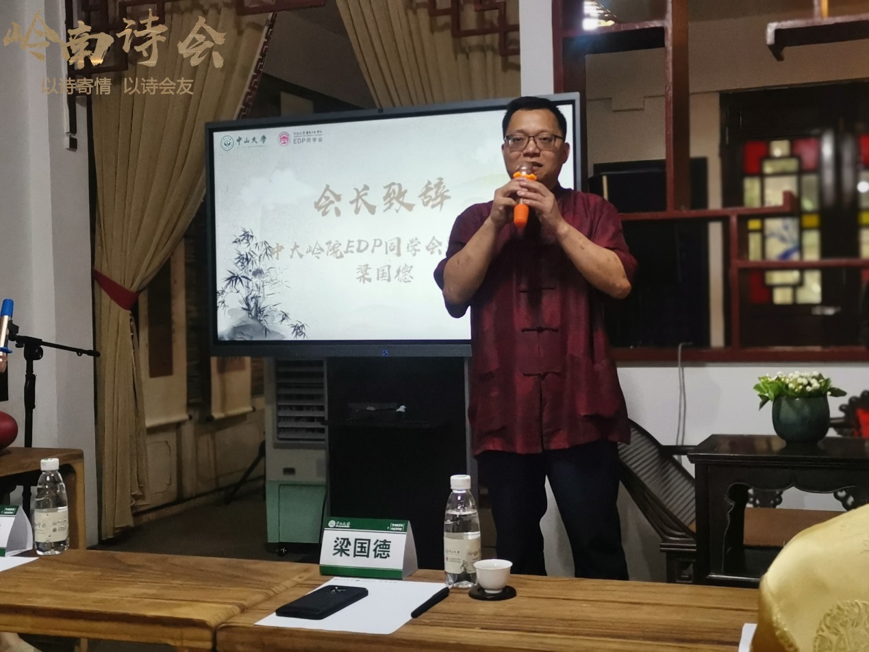中山大学岭南学院EDP同学会执行副会长梁国德代表主办方致欢迎辞。欢迎大家来如此富有岭南特色的南雅堂举办“岭南诗会”,远离喧闹的都市,身处大自然让烦躁的心灵得到解脱。“服务会员,资源共享”是中大岭院EDP同学会的精神,学习部将全心全全意服务会员,感谢中大领导、各方企业家校友一如既往的支持与鼓励!