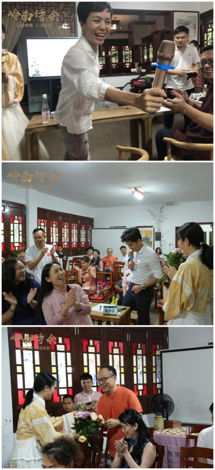 诗友们有的暗暗欢喜,因为胸有成竹;有的面有难色,因为想到的诗词已经被诗友咏颂;有的喜上眉梢,因为已经顺利答出;有的开怀大笑,因为最后一刻急中生智回答正确。全场气氛热烈紧张,诗友们都纷纷为答对者鼓掌,更有汉服美女送上鲜花。