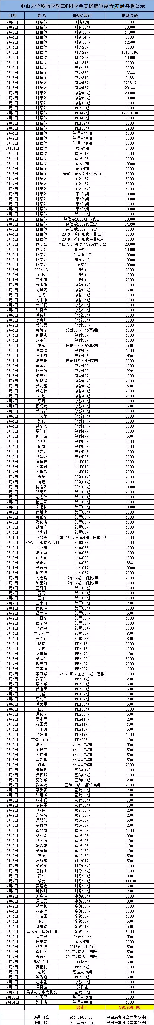 备注:还有很多中大EDP校友已经通过其他渠道捐款捐物奉献爱心,在此不一一列举,感谢中大人的大爱!