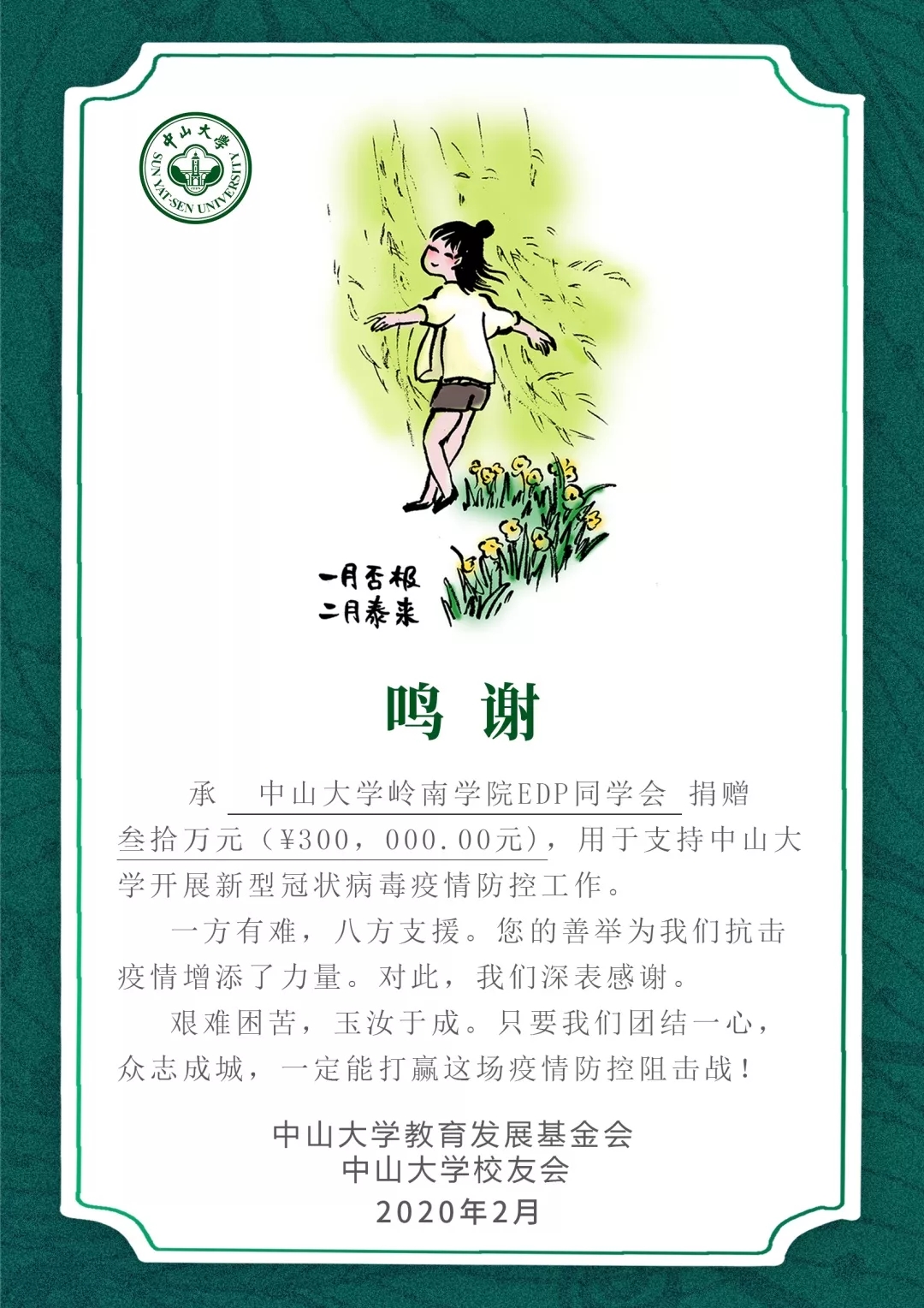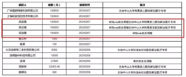 2月10日,中山大学校友会官微公示如上。中山大学教育发展基金会已确认收款由中山大学岭南学院EDP同学捐出的30万元。