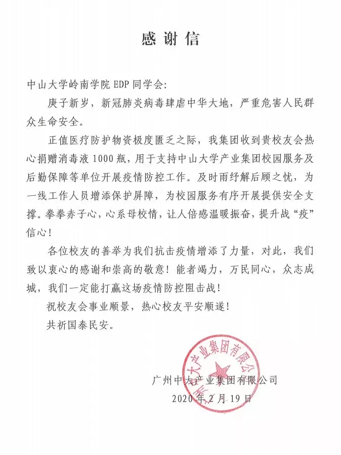 您好!2月1日,中山大学岭南学院EDP同学会向所有校友发出倡议,为抵抗疫情捐资捐物。自募捐倡议发出后,得到了广大校友们的积极响应。
