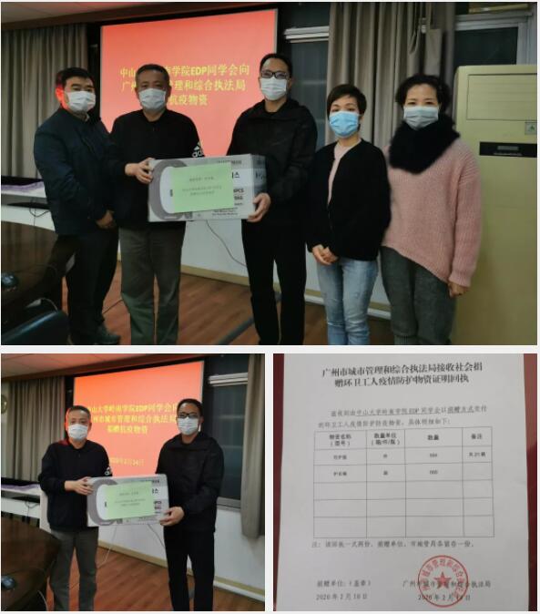 2月14日,中山大学高等继续教育中心韦小妹副主任、中山大学岭南学院EDP同学会吴春清会长及谢晓鸣校友三位代表中山大学岭南学院EDP同学会为广州市城市管理和综合执法局捐助防护服504件,护目镜600副。捐助的物资用于环卫系统工作者抗疫工作期间的防护。