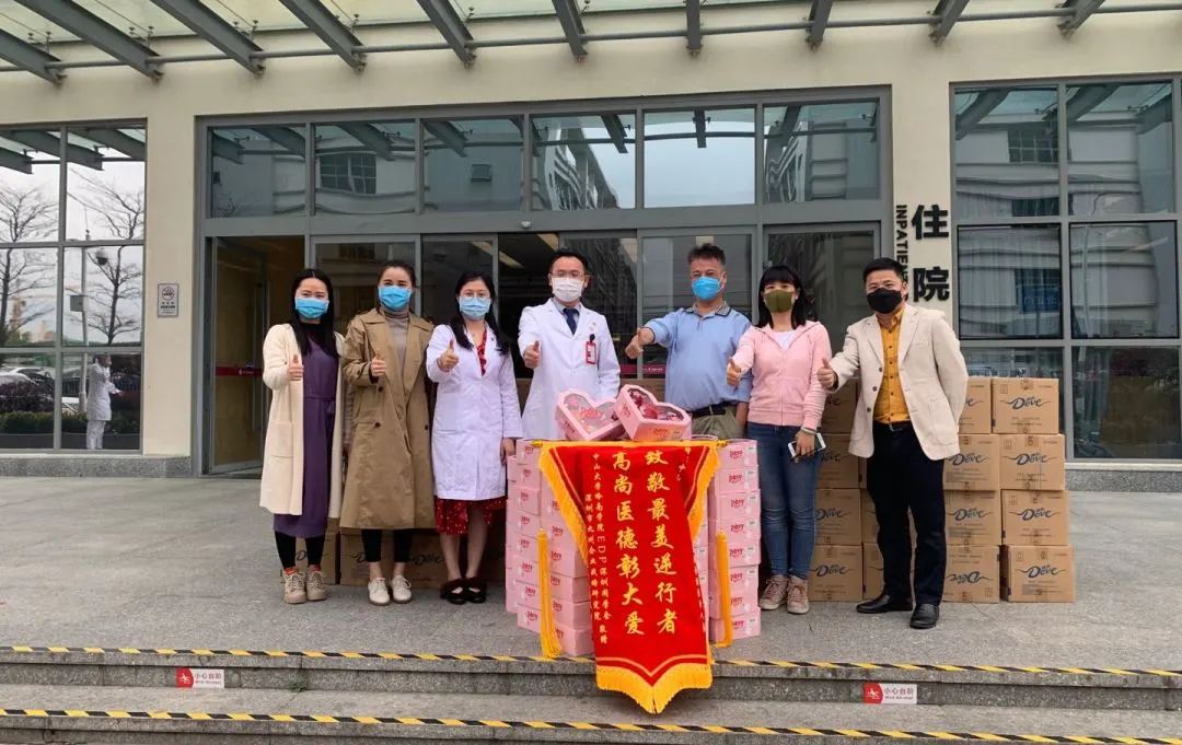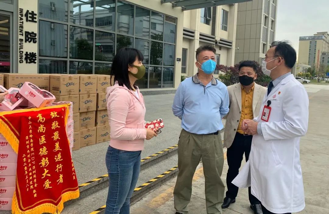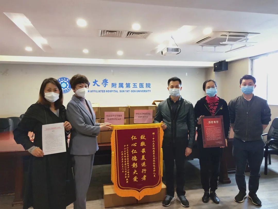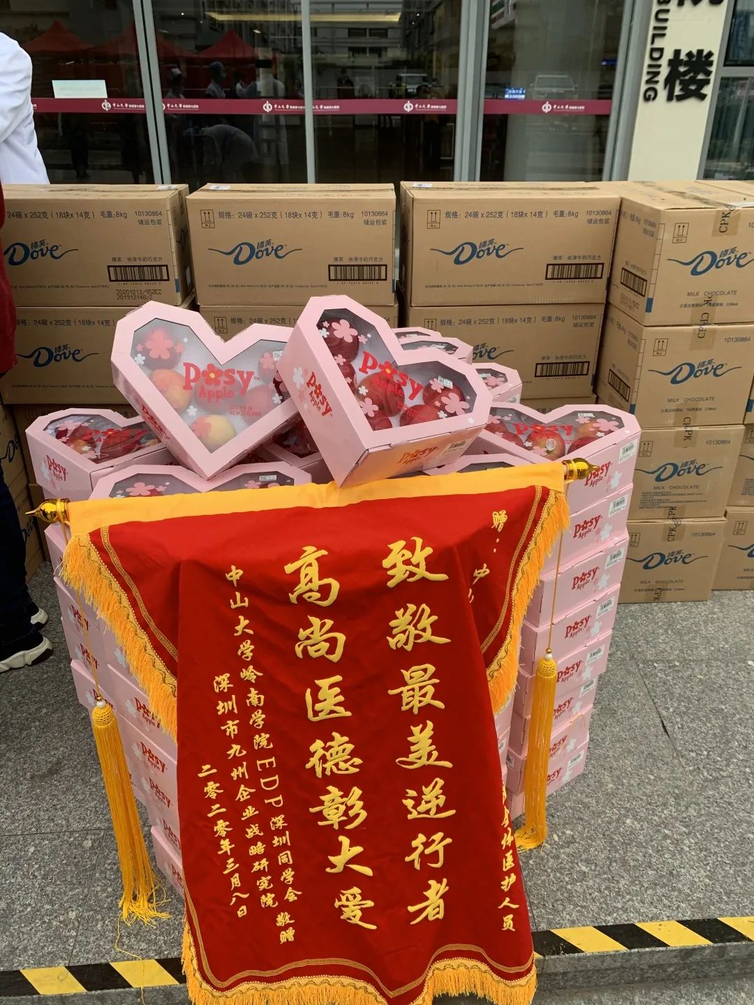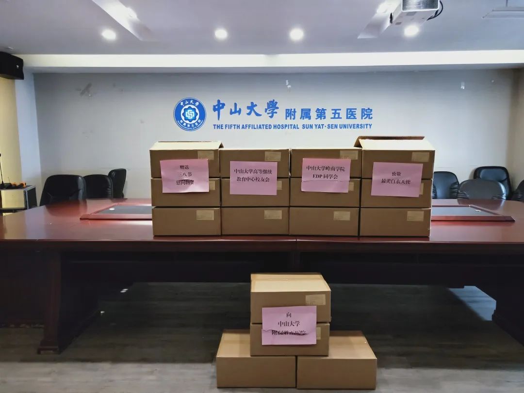 中山大学高等继续教育中心珠海基地主任邓长虹老师、中山大学岭南学院EDP同学会校友代表营销9期的苏和同学,两位代表参加了慰问活动。他们向中山大学附属第五医院党委书记林伟庭送上了锦旗和感谢信,并向全院2100名女性医护工作者赠送了免洗手消毒凝胶、巧克力等慰问品,以表感谢和祝福。