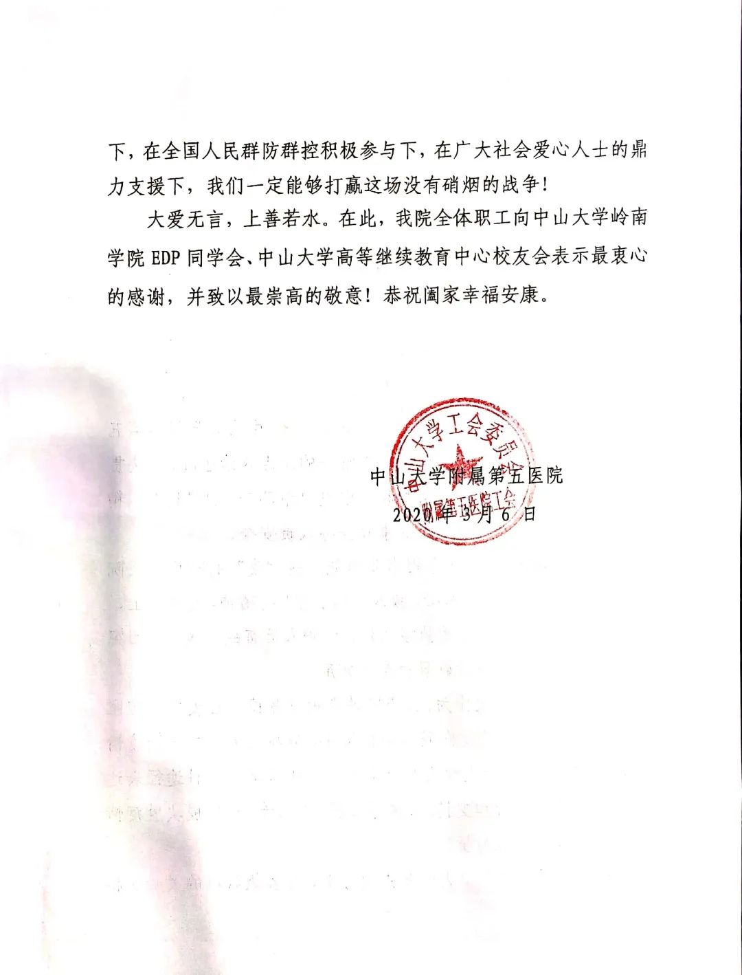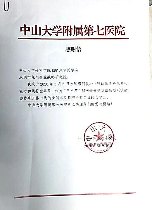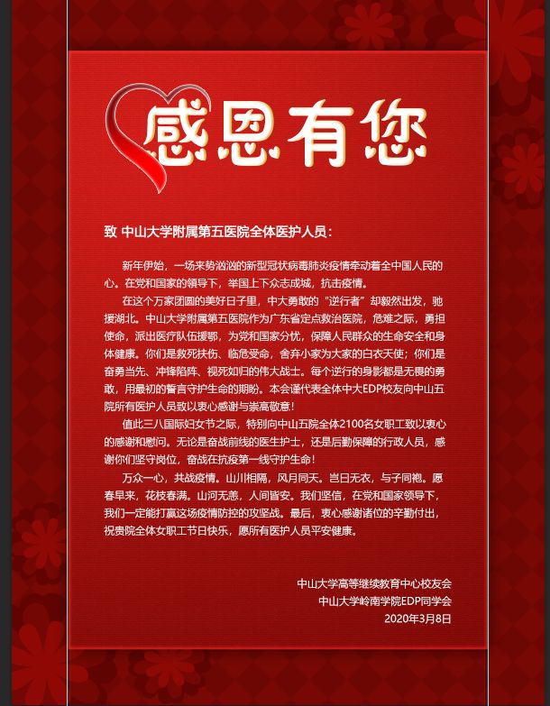 为了致敬最美白衣天使,在这个特殊节日前夕,3月6日下午,中山大学高等继续教育中心校友会、中山大学岭南学院EDP同学会和EDP同学会深圳分会,分别去到珠海市中山大学附属第五医院和深圳市中山大学附属第七医院,向奋战在抗击疫情一线的医护工作者致以衷心感谢和崇高敬意!