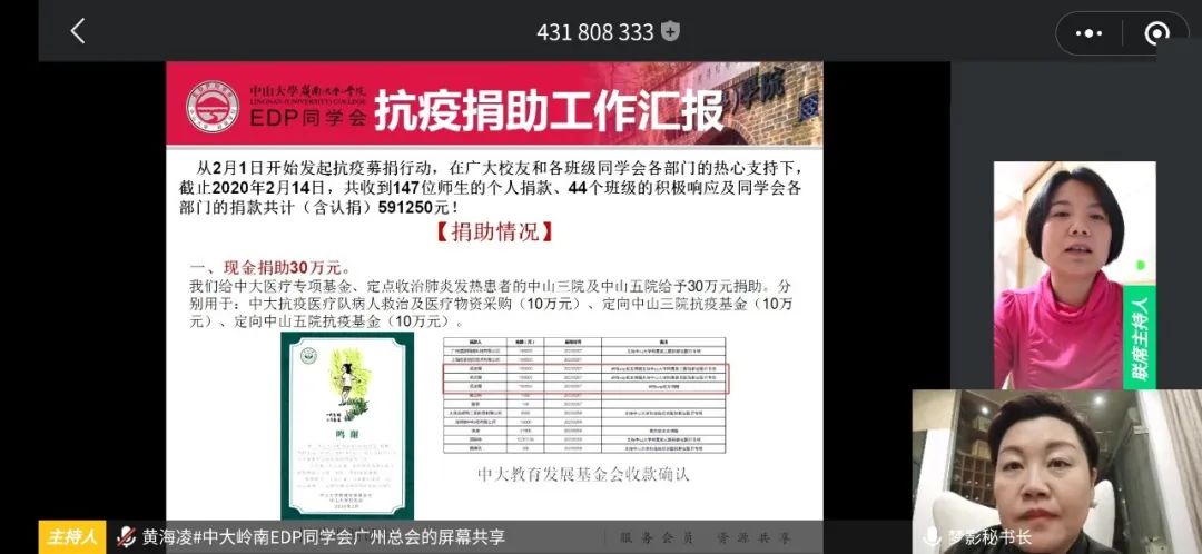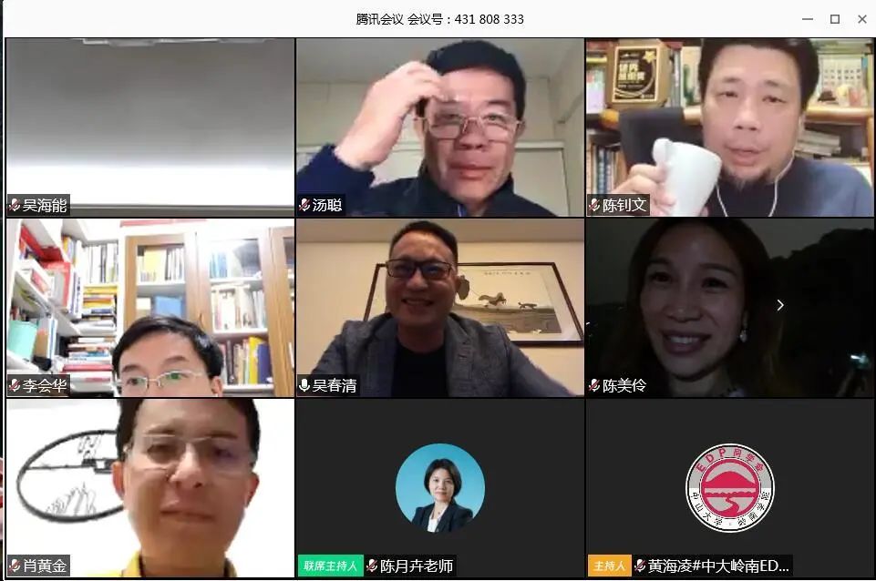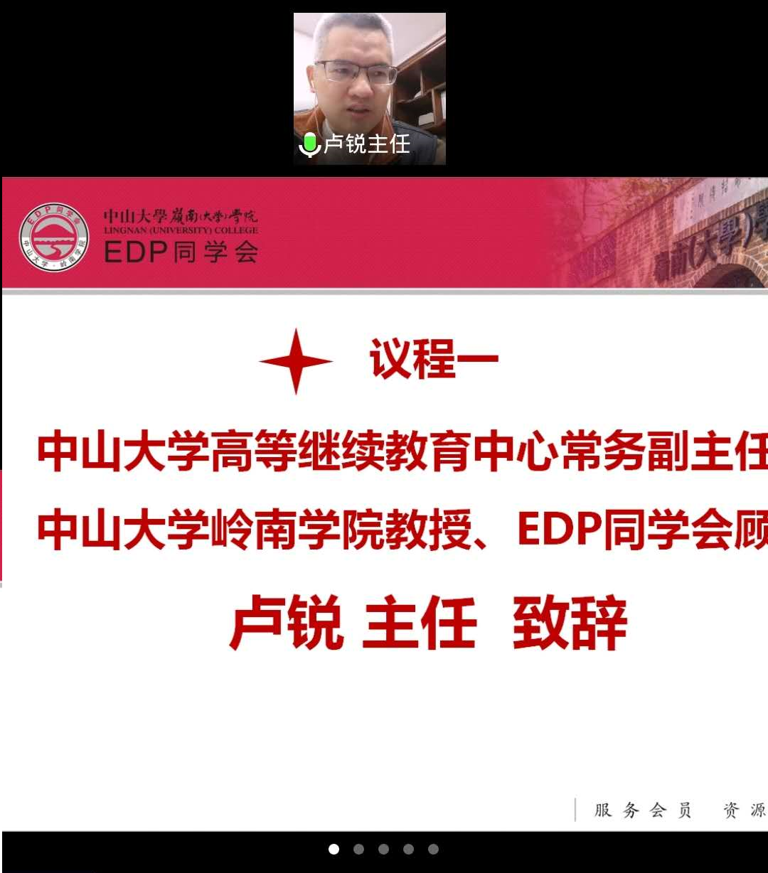 4月2日晚,在吴春清会长和韦小妹老师的组织下,中山大学岭南学院EDP同学会会长们在这特殊的非常时期发起了线上沟通会,特邀中山大学高等继续教育中心常务副主任卢锐教授参与指导,就疫情时期如何发挥我们同学会的力量,服务校友企业,帮助校友企业复工复产等话题展开讨论。本次线上会议由张梦影秘书长担任主持。