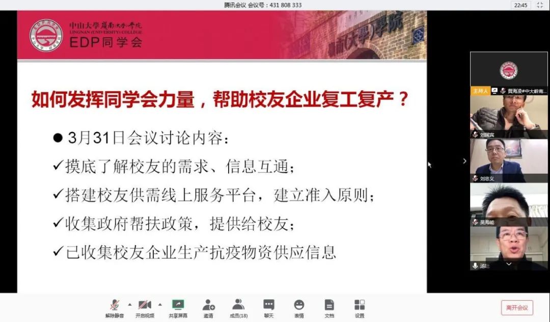 后续中山大学岭南学院EDP同学会将继续推动会议决策的执行,如推出线上精英校友沙龙(分享企业实际遇到的困境与解决思路心得体会)、搭建校友供需平台、分享政府帮扶政策、收集共享校友企业抗疫物资供应信息等等,为帮助校友企业快速恢复生产而出力。