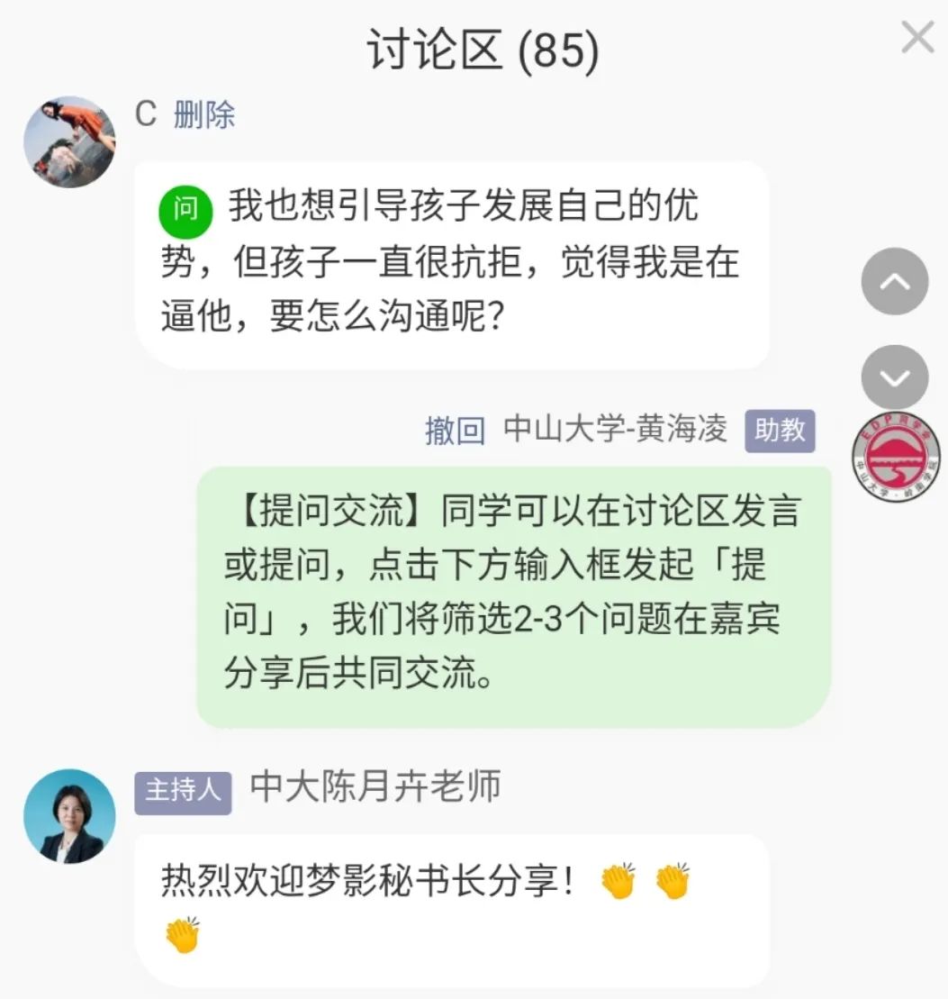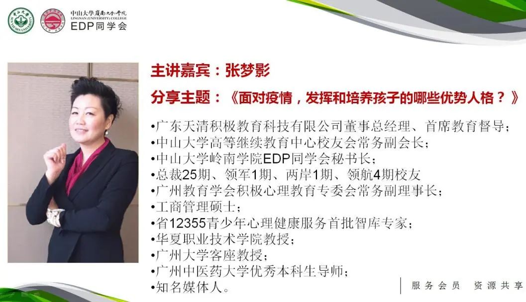 学校有名师,同学会有名将。疫情下,企业遭受巨大的经营压力,家庭也面临着众多压力,中山大学岭南学院EDP同学会“会长开讲了”线上分享沙龙第二期,特邀诚邀到中山大学高等继续教育中心校友会常务副会长、中山大学岭南学院EDP同学会秘书长、广东天清积极教育科技有限公司董事总经理张梦影以及广州市华颖外国语学校校长、广州教育学会积极心理教育专业委员会秘书长马新两位嘉宾担任主讲,给我们释放心理压力,解读疫情下家庭教育的问题。