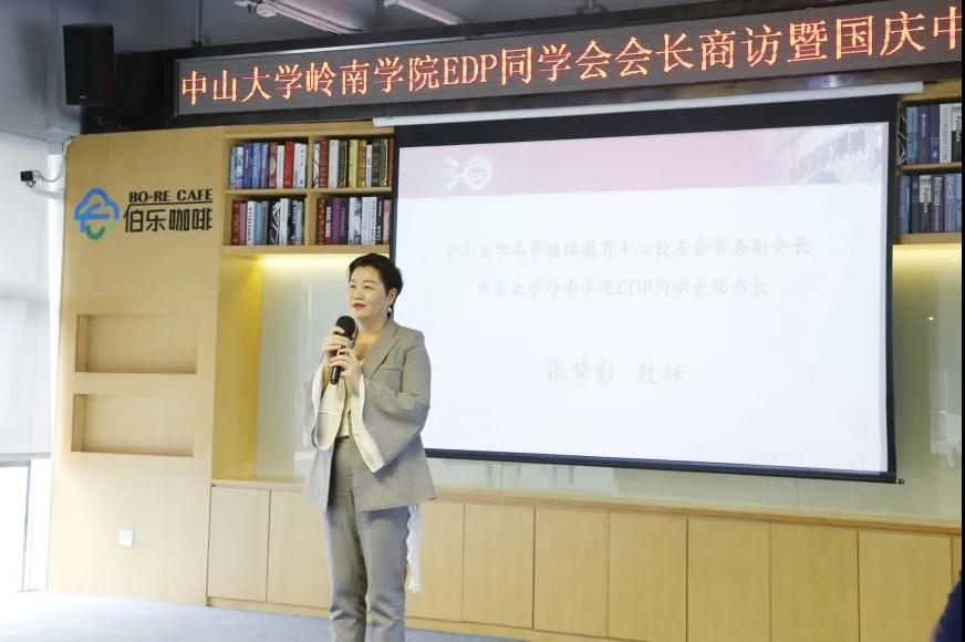 中山大学岭南学院EDP同学会秘书长张梦影为本次商访活动致辞。秋意浓,情谊浓。秘书长表示经历过战疫这一次巨大的考验,我们会长之间的团结互助的精神更加坚韧,并祝愿大家企业经营越来越好,同时带动EDP同学会的交流发展,一同前行。
