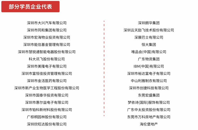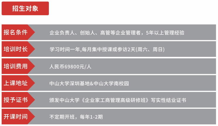 企业家工商管理高级研修班(深圳班) 2024年6月 咨询电话席老师 020-84112121 13929594057 吴老师020-84113530 17328320870 上课地点:中山大学深圳产学研大楼(深圳市南山区科技园南区粤兴四道1号) 导航痕迹 中山大学岭南学院高层管理教育(EE)中心 公开课程 企业家工商管理高级研修班(深圳班) 综合 | 企业家工商管理高级研修班 综合 | 企业家工商管理高级研修班(深圳) 综合 | 经理人工商管理研修班 综合 | 青商学堂 综合 | 领军企业家科技与人文高级研修班 专业 | 金融投资与资本运作班 专业 | 财务总监高级研修班 专业 | 营销管理高级研修班 短训课程 学习卡 企业家工商管理高级研修班(深圳班) 课程特色课程设置招生对象报名事项师资力量学生情况增值服务学员风采