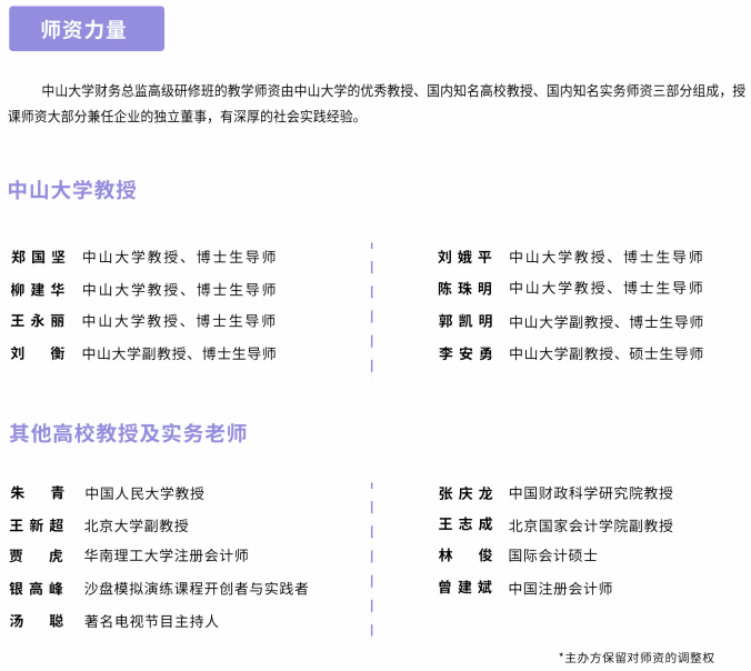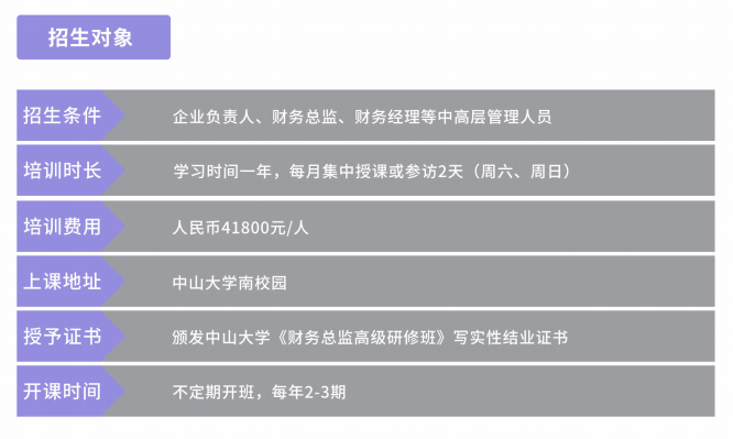 财务总监(CFO)高级研修班 2024年3月、8月、11月 咨询电话席老师 020-84112121 13929594057 吴老师 020-84113530 17328320870 导航痕迹 中山大学岭南学院高层管理教育(EE)中心 公开课程 专业|财务总监高级研修班 财务总监高级研修班 综合 | 企业家工商管理高级研修班 综合 | 企业家工商管理高级研修班(深圳) 综合 | 经理人工商管理研修班 综合 | 青商学堂 综合 | 领军企业家科技与人文高级研修班 专业 | 金融投资与资本运作班 专业 | 财务总监高级研修班 专业 | 营销管理高级研修班 短训课程 学习卡 财务总监高级研修班 课程特色课程设置招生对象报名事项师资力量学生情况增值服务学员风采