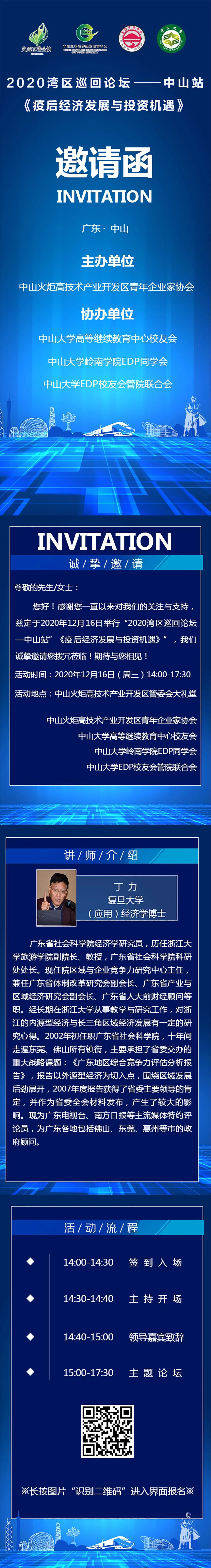 导航痕迹 中山大学岭南学院高层管理教育(EE)中心 活动预告 湾区讲座 | 2020巡回讲堂—中山站《疫后的经济发展与投资机遇》 扫描此二维码分享 湾区讲座 | 2020巡回讲堂—中山站《疫后的经济发展与投资机遇》 发布人:EE中心 发布日期:2020-12-11 活动时间 2020年12月16日 14:00 - 2020年12月16日 17:30 活动地址 中山火炬高技术产业开发区管委会大礼堂