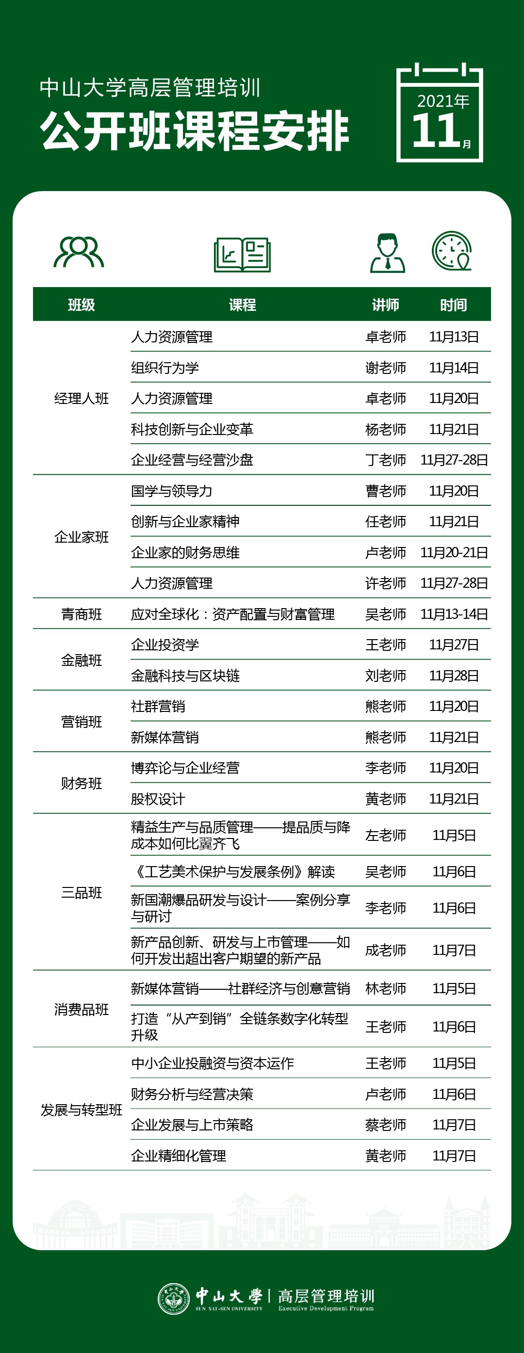 导航痕迹 中山大学岭南学院高层管理教育(EE)中心 活动预告 中山大学高层管理培训十一月公开课课程表 扫描此二维码分享 中山大学高层管理培训十一月公开课课程表 发布人:EE中心 发布日期:2021-11-02 活动时间 2021年11月01日 09:34 - 2021年11月30日 09:34 进学致和,行方思远。 以下是高层管理培训公开课11月课程表。新班11月28日开学,欢迎咨询报名加入新班!