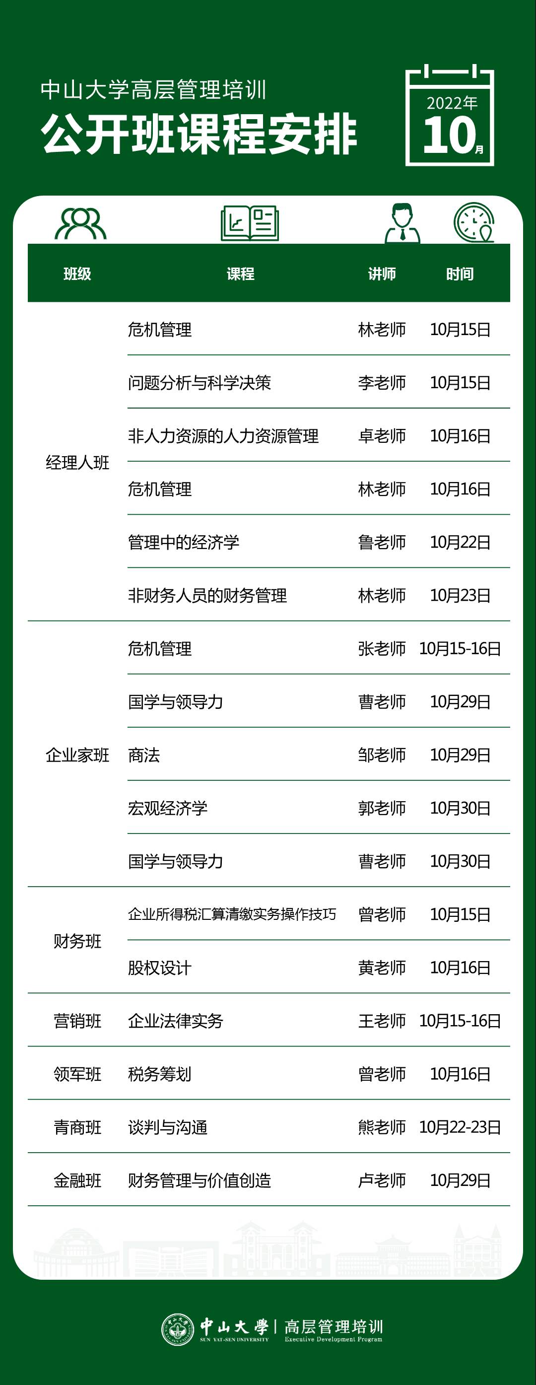 以下是高层管理培训公开课10月课程表,新班将在10月22日开班,欢迎咨询报名加入新班!