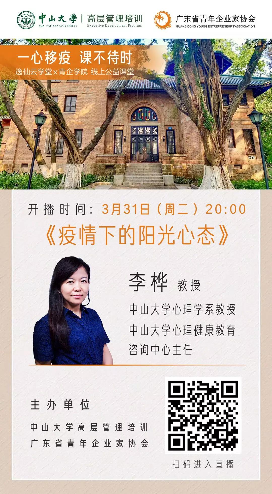 导航痕迹 中山大学岭南学院高层管理教育(EE)中心 活动预告 逸仙云学堂丨李桦教授《疫情下的阳光心态》 扫描此二维码分享 逸仙云学堂丨李桦教授《疫情下的阳光心态》 发布人:EE中心 发布日期:2020-03-13 活动时间 2020年03月31日 20:00 - 2020年03月31日 21:00 活动地址 逸仙云学堂线上课程