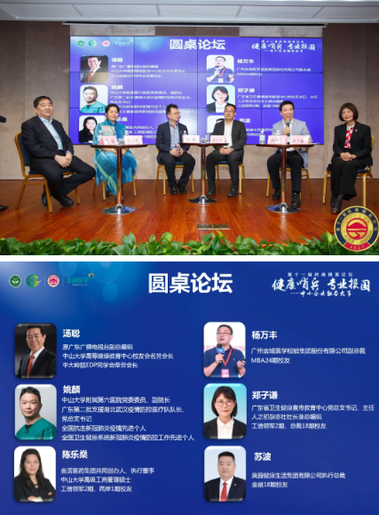 随后,圆桌论坛环节由中山大学高等继续教育中心校友会名誉会长、原广东广播电视台金话筒汤聪会长领衔金域医学杨万丰、中山附属六院副院长姚麟、广东省卫健委宣传中心主任郑子谦、金活医药执行董事陈乐燊、奥园健康总裁苏波等精英企业家校友为我们呈上干货满满、精彩纷呈的大咖对话,并在从零到一、专业报国、中小企业能办大事、健康中国这四个关键点上进行了深度探讨。