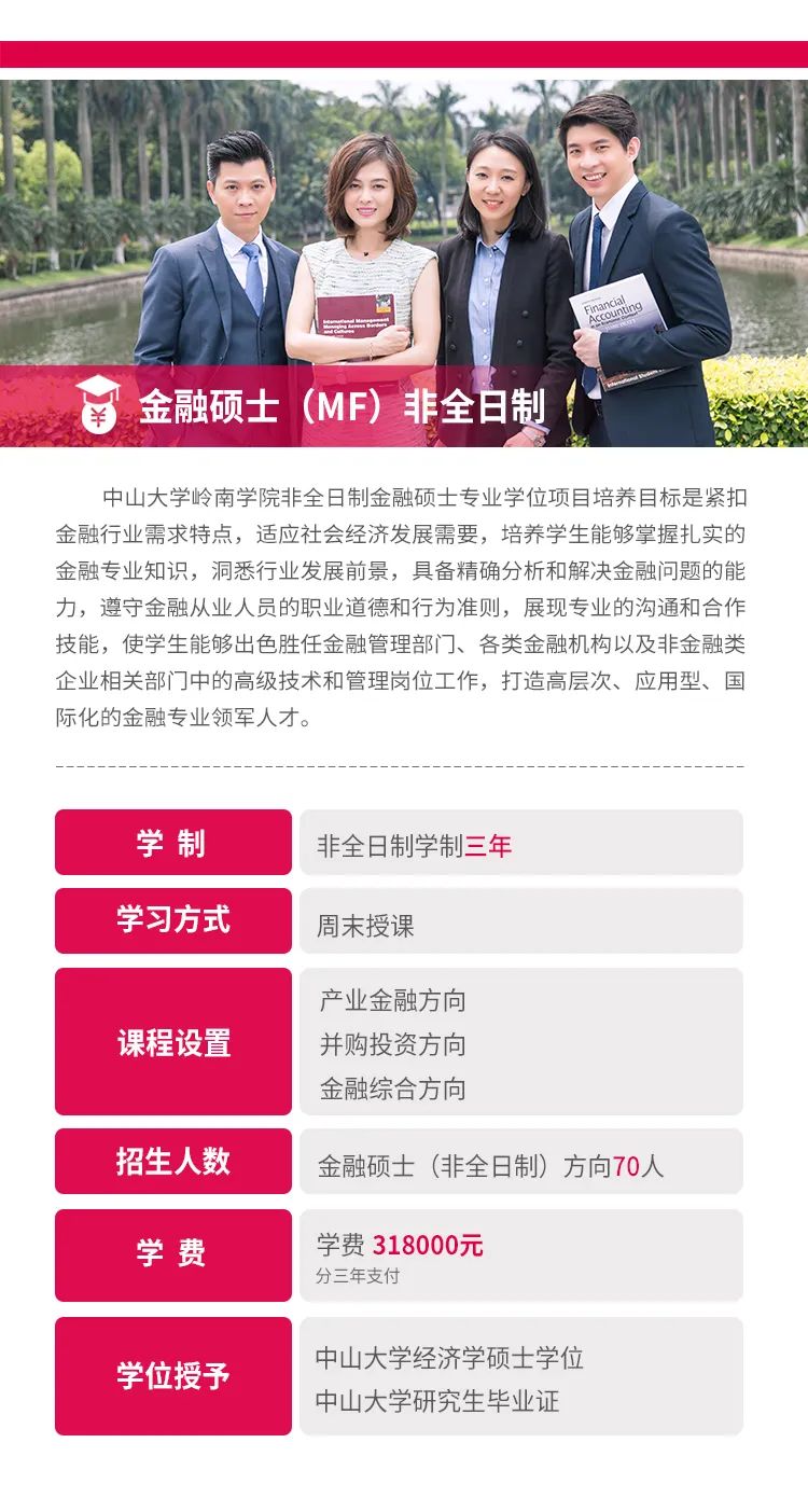 中山大学岭南学院全日制金融硕士项目成立于2010年,2011年开始招生,学制两年。金融硕士项目培养具有坚实的经济与数理基础,掌握现代金融理论、方法和技能,熟练运用金融模型和定量分析工具解决实际问题,拥有前瞻性国际视野并能适应资本市场变化的高层次金融专业人才。除全日制硕士项目外,2022年开始招收非全日制金融硕士和保险硕士。