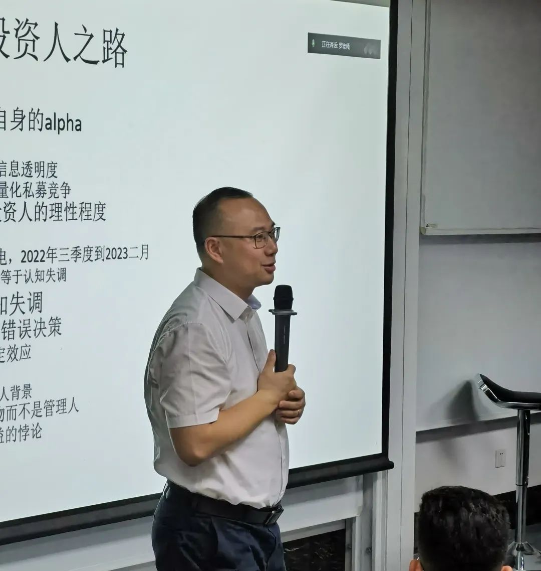 随后,吴振华先生向同学们梳理了“中国量化私募基金”的发展史,随着量化私募的发展,量化投资人资产的选择也从2015年的单一中性产品cta到后期裸多和fof的出现,发展到现在的全军覆没,究其根本在于人才的局限性使得投资人无法及时认知自己的错误决策。他告诫同学们,身为投资人,要破解这一问题首先需解除管理人锚定效应;其次是关注投资标的物而不是管理人;最后是识别规模和收益的悖论。