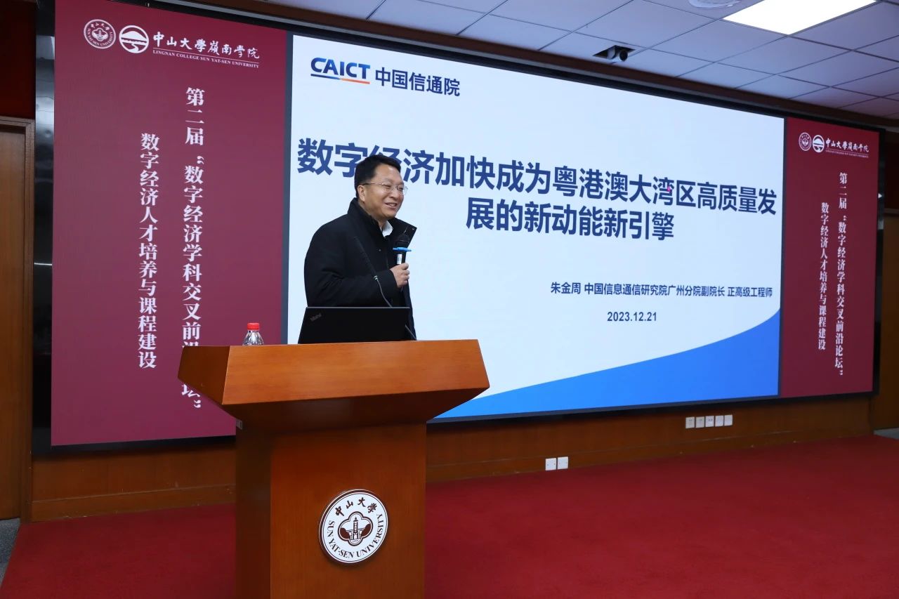 中国信息通信研究院广州分院副院长朱金周先生以《数字经济加快成为粤港澳大湾区高质量发展的新动能新引擎》为题做主旨演讲。他重点阐述了数字经济作为粤港澳大湾区高质量发展的新动能新引擎的具体情况,并详细介绍粤港澳大湾区数字经济发展的政策安排。