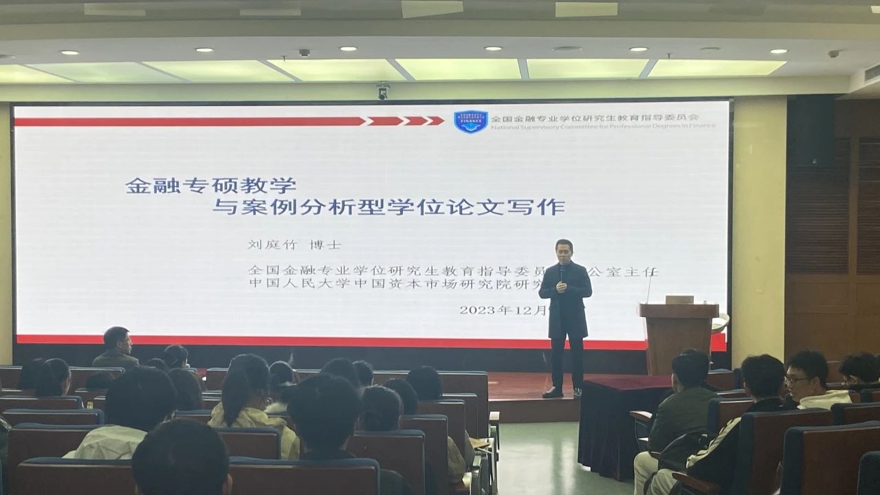 2023年12月23日下午,中山大学岭南学院专硕教育中心邀请了全国金融专业学位研究生教育指导委员会办公室主任、中国人民大学中国资本市场研究院研究员刘庭竹博士,为我院专硕项目学子做题为《金融专硕教学与案例分析型学位论文写作》的讲座。岭南学院院长助理、专硕教育中心主任柳建华教授担任本场讲座的主持人,当天讲座现场座无虚席。