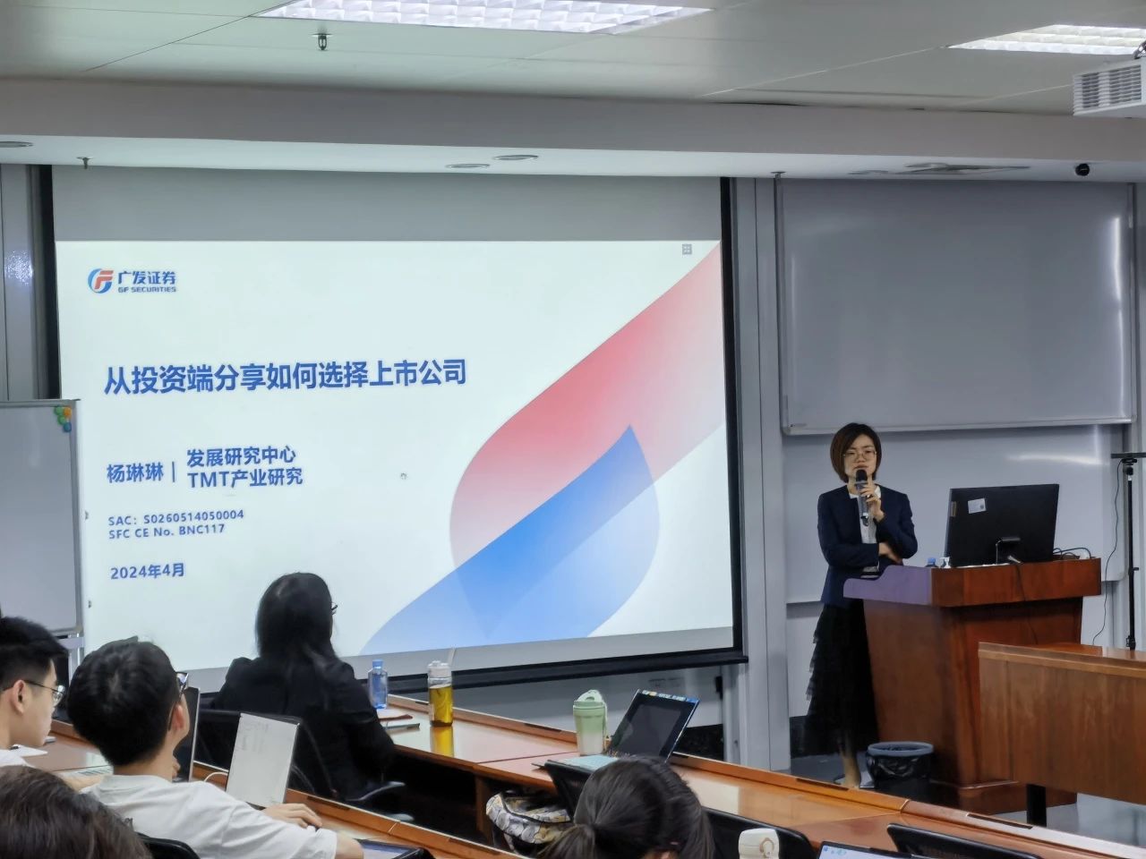 “从投资端分享如何选择上市公司”专题课程授课老师是广发证券的杨琳琳老师。杨老师作为资深投资人现身说法,用案例从产业领域、团队背景、研发能力、经营指标等角度解读优质上市公司的辨别方法,并从投资的视角,向同学们分析投资工作的内容和特点以及职业规划。