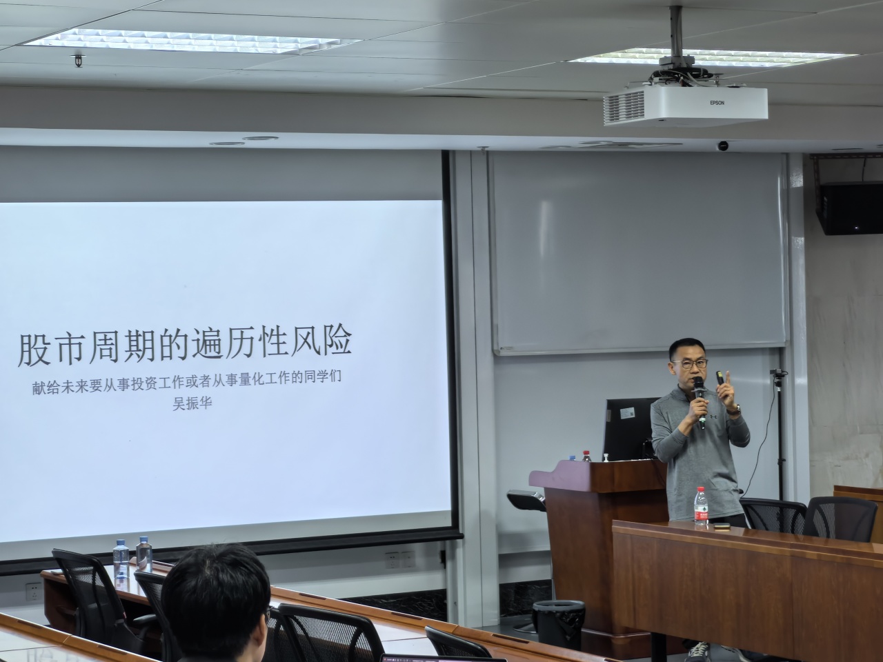 活动伊始,吴振华导师以“股市周期的遍历性风险——人工智能与量化”为主题进行了分享,向大家介绍了人工智能在金融量化领域应用的原理;借微盘股大崩盘的例子引出了人工智能在量化操作过程中的弊端,并着重分析了目前量化领域AI无法完全替代人类的原因。