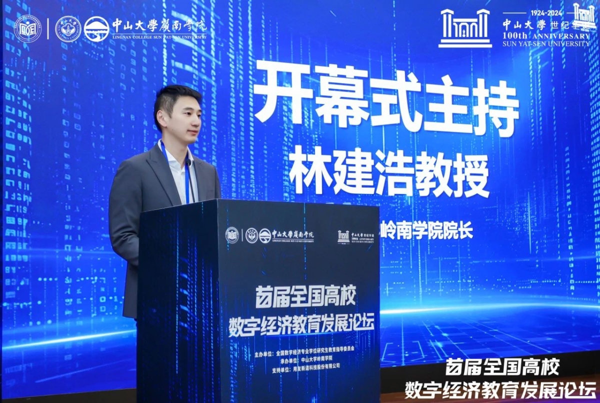以“数字中国建设与数字经济人才培养”为主题的开幕论坛在热烈的氛围中开启,全国数字经济教指委委员、中山大学岭南学院院长林建浩教授担任开幕式主持。