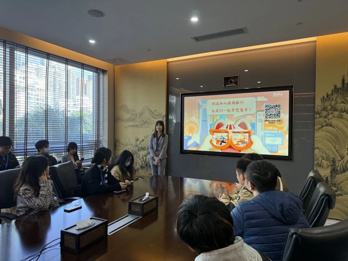 分组参观后,招行总行人力资源部负责人向同学们详细介绍了招商银行的基本情况、业务范围、工作环境和招聘计划及流程等。任职于跨境金融部的2021届校友代表张佳昕和同学们分享了她的职业发展经历,鼓励大家认真规划职业方向。