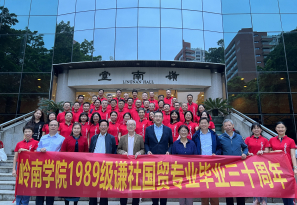 2023年10月21日下午,中山大学岭南学院1989级谦社国贸专业校友毕业30周年值年返校活动在岭南堂三楼陈荣捷讲学厅举行。40多位同学再次回到母校,忆往事、看今朝、畅未来。中山大学岭南学院党委书记黄毅博士以及当年的任课老师陆军、王则柯、许罗丹、邹建华、卞瑜、邬励军、龙朝晖等出席活动。活动由89级校友苏思昶主持。