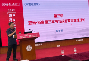 2022年7月26日,由中山大学岭南学院举办的第二届《中观经济学》师资培训顺利完成了第二天的课程内容:《亚当·斯密第三本书与政府双重属性理论》和《区域政府竞争》,课程内容分别由陈云贤教授和徐现祥教授主讲,华南理工大学黄亮雄副教授主持。 正式上课前,黄亮雄副教授简要介绍了课程内容,陈云贤教授开始讲授第三讲《亚当·斯密第三本书与政府双重属性理论》。