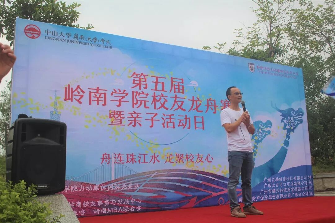 下午两点,各队伍在舞台前有序列队,介绍过嘉宾和各队伍之后,岭院MBA中心的邬金涛主任给我们带来了精彩的开场致辞,主任的致辞激起了在场校友们对“岭南一家亲”和“传承岭南精神”的共鸣,随后,邬金涛主任同其他四位嘉宾一起宣布本次活动正式开幕,他们分别是岭南学院MBA校友会监事长佘志勇学长、广州儒兴科技有限公司范宝斌学长、广州力动康体廖鸣新副总经理和岭南学院国际龙舟队运营总监彭毅学长。